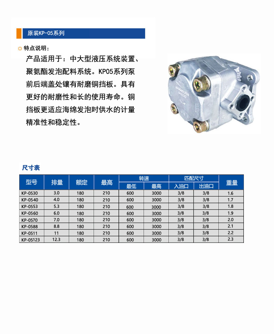 產品適用于:中大型液壓系統裝置、聚氨酯發泡配料系統。KP05系列泵前后端蓋處鑲有耐磨銅擋板。具有更好的耐磨性和超長的使用壽命。銅擋板更適應海綿發泡時供水的計量精準性和穩定性