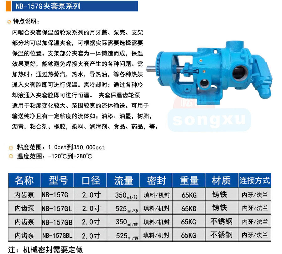 內(nèi)嚙合夾套保溫齒輪泵系列的月牙蓋、泵殼、支架 部分均可以加保溫夾套,可根據(jù)實(shí)際需要選擇需要 保溫的位置。支架部分夾套為一體鑄造而成,保溫 效果更好,能夠避免焊接夾套產(chǎn)生的各種問(wèn)題。需 加熱時(shí):通過(guò)熱蒸汽,熱水,導(dǎo)熱油,等各種熱媒 通入夾套腔即可進(jìn)行保溫。需冷卻時(shí):通過(guò)各種冷 卻液通入夾套腔即可進(jìn)行恒溫。 夾套保溫齒輪泵 適用于粘度變化較大、范圍較寬的流體輸送。可用于 輸送純凈且有一定粘度的流體如;油漆、油墨,樹脂, 瀝青,粘合劑、橡膠,染料、潤(rùn)滑劑、食品、藥品,等。