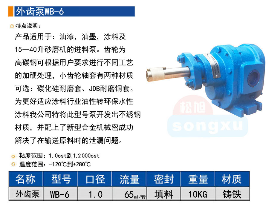 產品適用于:油漆,油墨,涂料及 15一40升砂磨機的進料泵。齒輪為 高碳鋼可根據用戶要求進行不同工藝 的加硬處理,小齒輪軸套有兩種材質 可選:碳化硅耐磨套、JDB耐磨銅套。 為更好適應涂料行業油性轉環保水性 涂料我公司特將此型號泵開發出不繡鋼 材質,并配上了新型合金機械密成功 解決了在輸送原料時的泄漏問題。