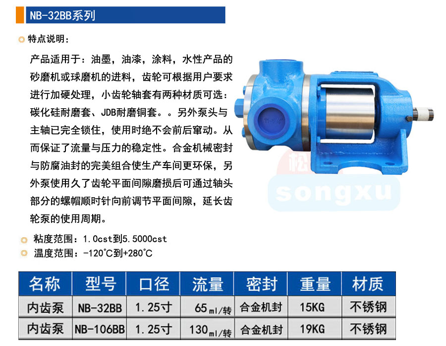 產品適用于:油墨,油漆,涂料,水性產品的砂磨機或球磨機的進料,齒輪可根據用戶要求進行加硬處理,小齒輪軸套有兩種材質可選:碳化硅耐磨套、JDB耐磨銅套。。另外泵頭與主軸已完全鎖住,使用時絕不會前后竄動。從而保證了流量與壓力的穩定性。合金機械密封與防腐油封的完美組合使生產車間更環保,另外泵使用久了齒輪平面間隙磨損后可通過軸頭部分的螺帽順時針向前調節平面間隙,延長齒輪泵的使用周期。